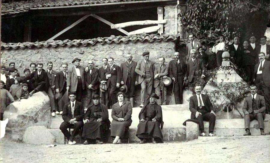 Fotografía de la inauguración de la Fuente de Trillayo, noticia del acontecimiento en La Voz de Liébana nº 757 de 30 de Mayo de 1924, el del paraguas es Álvaro Fernández Perez, que fue fotógrafo en Potes, comerciante y al fallecer era director del Banco Mercantil, también se puede ver sentado a Ángel Gutiérrez y en pié, Juan Reda, José María Bulnes, etc, en otra foto publicada en la revista se identifica a muchos mas. |