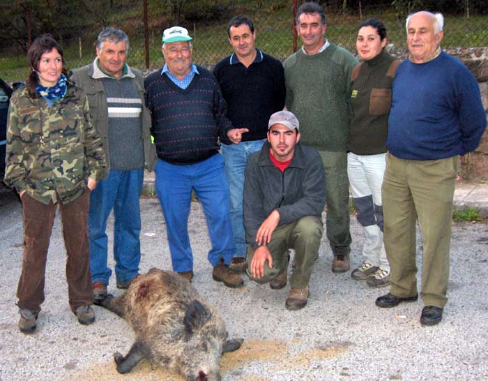Y cuando la cacería ya daba sus últimos coletazos, dos disparos resonaron en la canal del puerto de Trulledes. Dichos disparos fueron obra de Teyín, un invitado que repitió suerte ya que la semana pasada logró abatir un marrano. Hoy también dio buena cuenta de un gran ejemplar que con un solo tiro bajó rodando un buen puñado de metros. Teyín no sabía qué hacer con la pieza; le bajó arrastrando todo lo que pudo hasta que llegó a un río y pensó: "Basta, hasta aquí llegué pero ya no puedo más.., pesa mucho, igual supera los ochenta kilos y aún queda un gran trayecto para llevarle hasta donde llegan los coches!. Pidió ayuda a otros compañeros para sacar al jabalí, pero algunos ya se habían retirado de sus puestos, así que decidió vaciarle y dejarle metido en el agua para ir al día siguiente a recogerle.