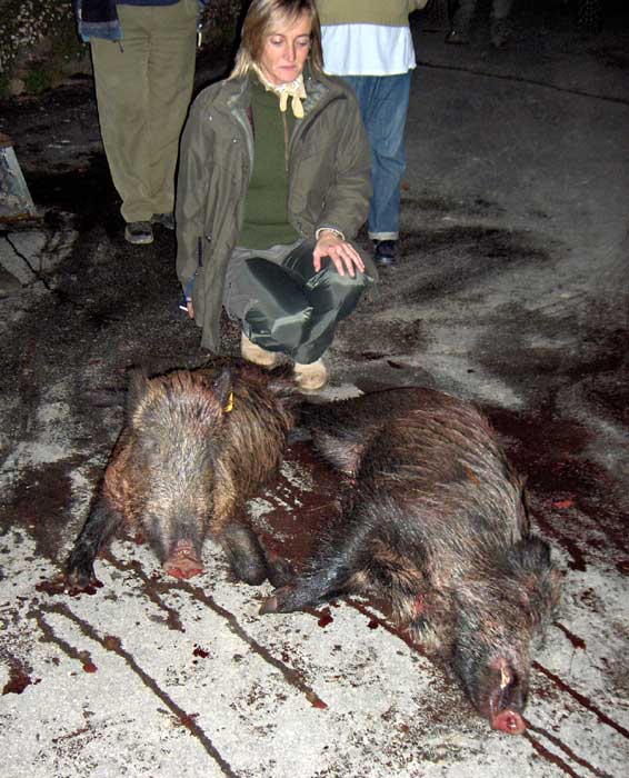 "Felicidades, Ivana......". "Gracias, Jorge....." respondió Ivana ya con voz radiante. "Ivana, eres la mejor....." "Qué grande eres Ivana.....". Solo faltaba la felicitación de su marido Chanchel. Pero no habían pasado ni cinco minutos cuando llegó a su lado y lo que allí pasó solo lo saben ellos, pero seguro que un cariñoso beso no faltaría. Era el bautizo jabalinero de Ivana y había que celebrarlo, y como únicos testigos estaban el jabalí muerto y el perro mordiendole.