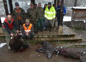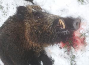 En Sierra la Cal fue Primo el que disparó a otro y el jabalí dio unos revolcones pero siguió su camino, dejando una ligera hilera de sangre en la nieve que allí había. Canchel y Aníbal también le tiraron hasta que el jabalí ya no pudo resistir más y quedó a merced de los perros, pero antes también dejó su sello en otros dos perros, uno de Aníbal y la perra de Abel, que también tuvieron que pasar por la consulta veterinaria.