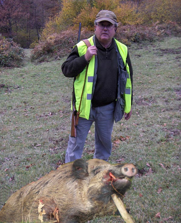 Los perros también llevaron otro jabalí hasta los puestos donde se encontraban Angel, el gasolineru de Potes, y un trozo más arriba Ramón Gaipo. Angel le tuvo en la mira, pero pensó que Ramón le podía tirar mejor que él. A Ramón le pareció lo contrario y tampoco le tiró, total que el marrano se marchó entre uno y otro y seguro que aún se está riendo de los dos cazadores.
