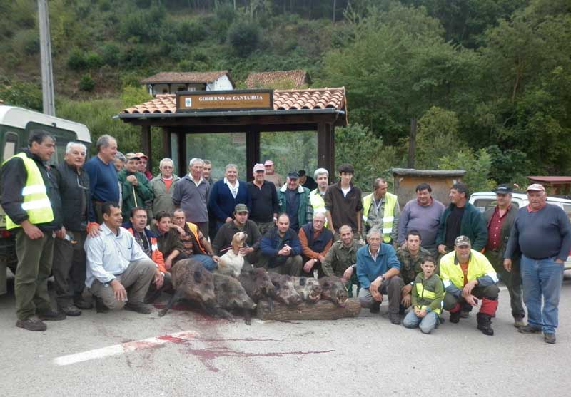 Eran las 9 y media cuando Jorge manda comenzar la cacería con la suelta de los perros. No tardaron en oírse los primeros ladridos, pero los jabalís no se veían por ninguna parte. "Los estamos pisando y no salen....", decían los monteros desde Matavega. Pero todo tiene su límite. Eran ya las diez de la mañana cuando desde el "mirador" (el mirador llaman a la curva de la carretera que va desde Trillayo a Cobeña, donde se avista éste pueblo). "Mira, miraaaaa, un jabalí por el prau, es grandísimu...". El jabalí había salido desde Matavegas y se encaminaba hacia la Sorbera. Pero unas yeguas que había en un prao le hicieron volverse y después de vadear el río se encaminó por los praos de Casajo en dirección de Castro. "Es muy grande...", repetían, a la vez que gritaban desde el mirador. "Esi se marcha para Arabedes, va en dirección a la carretera general y se marcha para allá," comentaban los entendidos. Pero no contaban que muy cerca ya de la carretera había colocado Jorge un puesto. Allí estaba Marcos que hoy debutaba con la cuadrilla. En cuanto Marcos le visualizó, le soltó un pepinazo pero no hubo suerte, el jabalí siguió corriendo, aunque cambió el rumbo, dirigiéndose ahora de nuevo al hondón de los praos de Casajo que llegó a cruzar. Cuando ya se iba a adentrar en el bosque sonaron dos disparos seguidos. Fue Aníbal el que los hizo. Aníbal no estaba muy seguro de haber hecho diana y cuando se acercó pudo comprobar que había fallado. Eso era lo que creía, ya que el jabalí no había dejado nada de sangre y había seguido su ruta. Aníbal metió a sus perros por donde había huido el marrano, y a los pocos minutos..., cual no sería su sorpresa al ver a sus tres perros dando aullidos y a la vez mordiendo a un hermoso jabalí. ¿Qué había sucedido?. Que los perros llegaron hasta el marrano cuando aún estaba vivo y éste se encargó de dejarles su etiqueta antes de cerrar la boca por completo. "Me cogió a los tres perros.......", avisaba Aníbal por la emisora. "El jabalí está muerto, pero tengo a los tres perros heridos. ¿Sabéis alguno el teléfono de Wladi?. "Sí, ahora mismo le llamo", le respondieron. Pero Wladi, (el veterinario), el sábado no estaba en Potes. "Rubén, hay que arrancar para San Vicente de la Barquera con ellos porque, sobre todo uno, tiene una buena tajá en una pata". Eran las 10 y media de la mañana y la cuadrilla se quedó sin tres perros y eso a principios de temporada no es una buena noticia. (Hay que reseñar que por la tarde volvieron los tres perros cosidos a casa y aunque tienen para unos días, seguro que saldrán adelante).