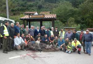 Efectivamente, enseguida llegó a la Sieta un jabalí que tenía mucho calor, ya que lo primero que hizo fue acercarse a un regato y darse un placentero baño. Pero no acertó al escoger la bañera, estaba en mitad de los prados y aquella zona estaba muy bien cubierta por los rifles. No tenía escapatoria, era su úñltimo baño. El marrano siguió su camino, pero ya había varios cazadores que le tenían dentro de su mira. Cuando el jabalí se fue acercando, sonó el primer disparo, su autor Pablo, el de Colio. El jabalí cambió su rumbo y la emprendió pradería arriba. Segundos más tarde suena otro, en esta ocasión de Ceci, y el marrano se quedó clavado, solo movía la cabeza pero era incapaz de dar un paso. Un tercer disparo de Felipe bastó para rematarlo y ver cómo el jabalí bajaba rodando unos veinte metros praos abajo. Parecía una pelota, o mejor que una pelota, un enorme globo por su tamaño. Pasaba de los 90 kilos y aparte de tener las dos patas delanteras rotas por efecto de las balas, lucía una bonita boca.