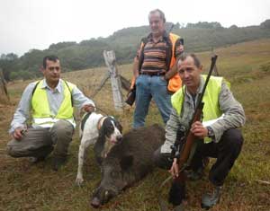 Solo falta añadir que a este último jabalí le dispararon tres tiradores y oficialmente se le atribuyó su muerte a Pablo, aunque hay serias dudas de si fue él quien le mató. El que esto escribe, estaba presente y cree que en realidad el que le rompió las dos patas delanteras por la misma altura fue Ceci, porque el jabalí estaba cruzado y a la vez parado en el momento del disparo. Si el jabalí va corriendo (así iba cuando disparó Pablo) es imposible que una única bala le rompa las dos patas a la misma altura, además una vez que sonó el primer disparo (el de Pablo) el marrano siguió andando unos metros. Con las dos patas rotas (quedaron colgando solo por la piel) era imposible dar un paso. Por tanto al César lo que es del César y a Ceci lo que le corresponde.