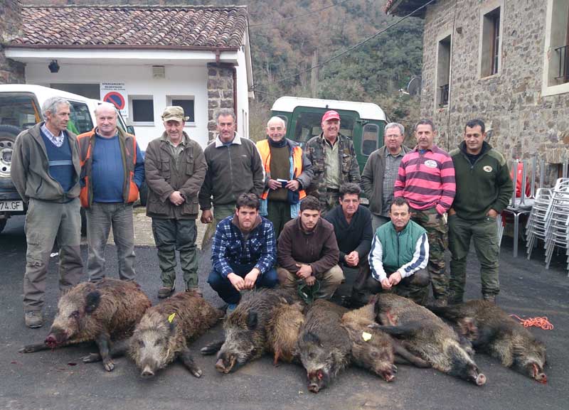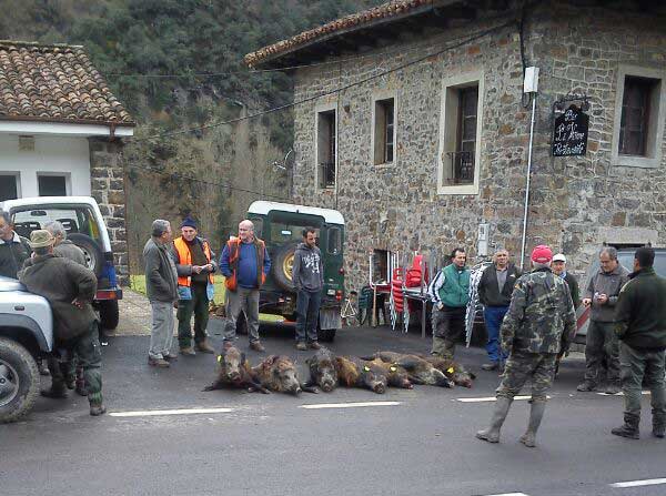 El siguiente le tocó a su sobrino Lucio, que es montero, pero siempre que tiene ocasión no la suele desaprovechar. Y hoy tampoco falló. Un ruido extraño le hizo ponerse en guardia. "Ahí viene algo grande......", pensó. Pero era tan intenso el ruido que también le pasó por un instante por su cabeza: "¿será un jabalí, o será el osu.."?. No tardó en descifrar el enigma, porque entre unas escobas vio asomar a un enorme jabalí que le venía de frente. Un solo disparo bastó para verle rodar unos metros y quedar completamente inmóvil. Era un buen jabalí, cercano a los 90 kilos, con una buena boca y con los costillares y la barriga llenos de "navajazos" de algún otro macho que se supone más fuerte que él. "Tiene unos cortes muy profundos, además bastantes recientes, como si se los hubieran hecho con un cuchillo", explicaba luego Lucio.
