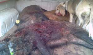 Por suerte en el lote había jabalís ya que los perros de Oscar, el de Turieno, y José Luis, de Lerones, levantaron por encima de este pueblo. "Acaban de levantar los perros, yo creo que llevan dos jabalís, atentos arriba..", avisaba Oscar. Allí estaba Artemio, de Tollo, un invitado, que tuvo la fortuna de ver a uno de ellos a una distancia prudencial. Le dio tiempo suficiente a prepararse y cuando creyó que le tenía a tiro, le soltó un zambombazo. El jabalí acusó el efecto de la bala, pero siguió su camino. Dos disparos a continuación le dejaron inmóvil para que le mordieran los perros.