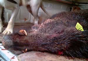 Oscar también levantó un jabalí, mejor dicho los perros de Oscar. Estaba en el Pico los Robles y tomó la ruta hacia la Argayá pero sin llegar a los puestos. Algo olió, oyó o vio que no le gustó y decidió cambiar de rumbo y meterse monte abajo para cruzar la carretera general entre Cabariezo y Cabezón y salirse del lote. Solo se pudieron coger los perros que iban detrás de él y como ya era la hora, todos a refrescarse a la Venta de Vieda y allí surgieron las consabidas conversaciones entre los cazadores donde todos se dieron por satisfechos y aunque solo se mató una pieza, salieron bastantes jabalís pero la puntería no estuvo muy fina. Todo lo compensaba el tamaño del jabalí abatido.