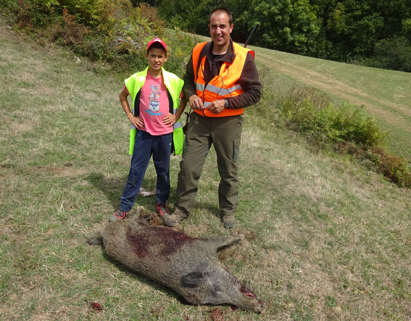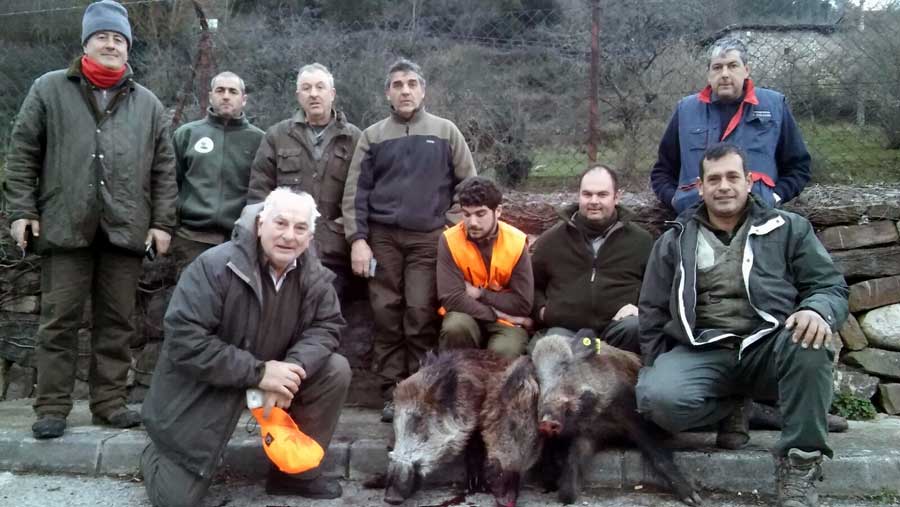 Pero la cacería seguía y los perros de Pepe, el de Ojedo, levantaron en Tundes, cerca de la Cueva Mora, un jabalí que emprendió una veloz carrera, encinal abajo, también en dirección al desfiladero. Pero éste no llegó a mojarse, ya que antes de llegar a la carretera general tomó el rumbo del “Caminu Vieju”, en dirección a Castro. Allí estaba de puesto José Angel, el de Cobeña, que de un único disparo le paró los pies. “Quién tiró…..?, preguntaba Jorge. No tardó mucho en responder, con la consecuente alegría José Angel: “Acabo de matar un jabalí……”. Y es que era su estreno en ésta temporada.