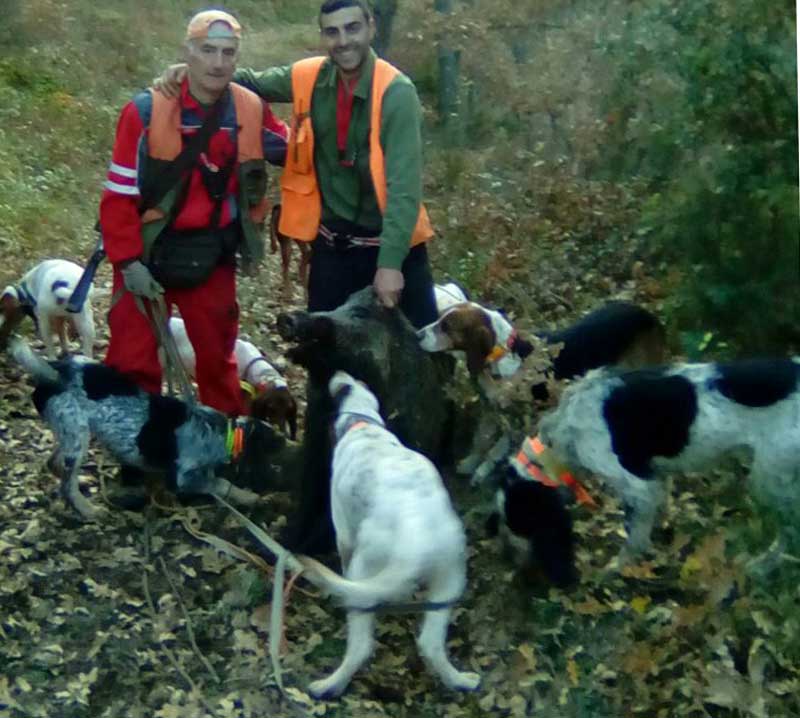 Los perros de Eloy estaban por la zona de Valcayo y encima del pueblo levantaron un jabalí que velozmente se metió monte abajo. “Atentos los que estáis en el riu, ahí os va un jabalí muy grande……”, avisaba el montero. Por más que abrieron los ojos, nadie vio al jabalí, sólo se dieron cuenta cuando vieron pasar los perros detrás y se adentraron en el lote de Fonfría, pero con tan buena fortuna que fueron capaces de volver a meter al jabalí en el lote donde se estaba cazando. Manuel Junco fue el primero en disparar pero con poca fortuna, luego le entró a Sergio, de Torices, que no falló y dejó al marrano a merced de los perros. Era un buen ejemplar con unas enormes defensas.