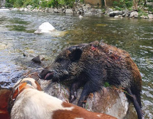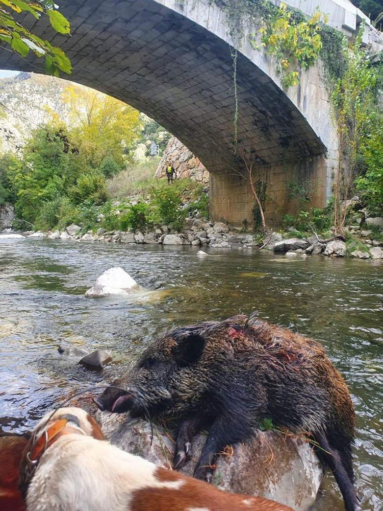 Pero no todo se “cocía” en la parte alta del lote, ya que al puente Juancho llegó un marrano perseguido de los perros. El jabalí cruzó el río Deva sin mucha dificultad pues ahora baja muy poca agua. En cuanto salió de darse el baño recibió el plomo de Benjamín que estaba allí muy cerca.