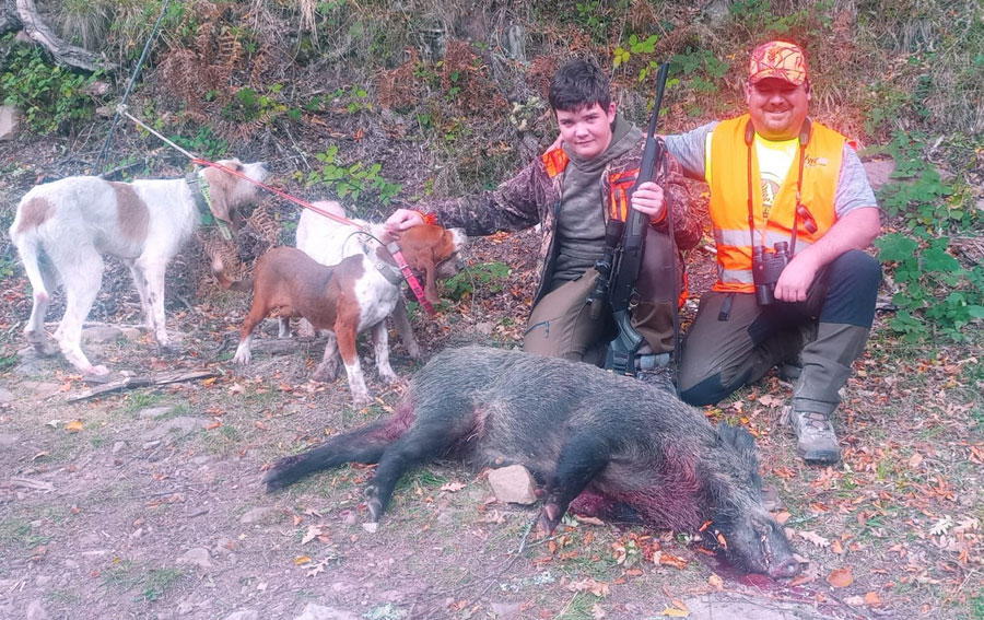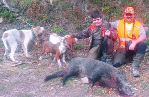 Otro que también se le da bien apuntar es Felipe. Hoy estaba de puesto en Verés y no quiso bajar del monte sin aprovechar la mañana. Un único disparo sirvió para ver rodar al jabalí unos cuantos metros y quedar a merced de los perros.