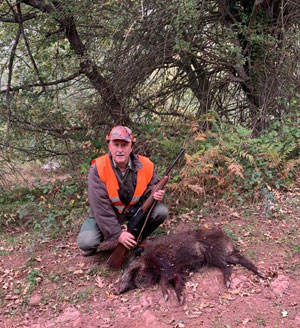 El que tuvo más suerte y mejor vista fue Chico, que unos metros más arriba, cerca de la riega, esperó al otro jabalí que venía sin los perros; Chico le pudo divisar mientras cruzaba la praería. No estaba muy lejos, así que, sin ponerse nervioso, le soltó un único disparo que paró en seco al marrano. “Ya cayó, aquí le tengo…..”, avisaba Chico todo contento, que hoy repitió la faena de la última cacería que también tocó pelo.