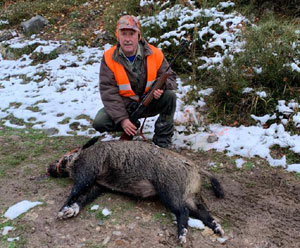 Si Jaime estaba contento, otro que también se lució fue Chico, que hay que pensar que está en vena. No es muy normal que en tres cacerías seguidas se toque pelo y hoy Chico demostró que, cuando se le presenta la ocasión, sabe salir de ella con éxito. Estaba por encima del pueblo de Redo y oía a los perros que se acercaban, se puso en guardia y enseguida apareció delante suyo una mole negra que se movía a buena velocidad. Chico le metió en la mira del rifle y le soltó un disparo para ver al marrano rodar unos cuantos metros. “Aquí le tengo, es muy guapu, pasará de los 80 kilos, con unas buenas y afiladas defensas”, avisaba el cazador.