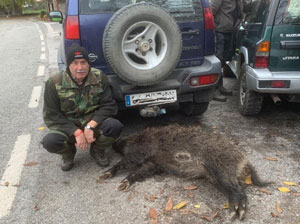 Entre el ruido de los todo-terrenos y el propio de los cazadores propició que un jabalí que estaba tranquilamente durmiendo la mañana, tuvo que levantarse deprisa y corriendo para buscar otra alcoba mejor. Pero, para su desgracia, esa alcoba no llegó a encontrarla, ya que pasé delante de Manuel Relea que estaba aún acomodándose en su apostadero y deprisa y corriendo pudo coger el arma, quitarle el seguro y disparar. Lo hizo en tres ocasiones, pero el jabalí emprendió una veloz carrera monte abajo. “Le dí…., le dí….., dio un saltu y marchó por ahí abajo arrastrando las patas de atrás. Es muy grane, no puede ir muy lejos”, avisaba Manuel. En el puesto más abajo estaba Carmen, una invitada que enseguida vio al jabalí. Al ser pendiente el terreno, el marrano seguía avanzando y Carmen, un tanto nerviosa, descargó toda la munición de la recámara hasta ver al jabalí dando los últimos coletazos.