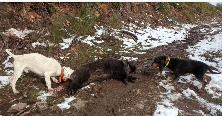 Bien empezaba el día, pues sin la ayuda de los monteros, ya se había cobrado un jabalí, y además de buen porte con una descomunal boca. Pasaba de los 90 kilos.