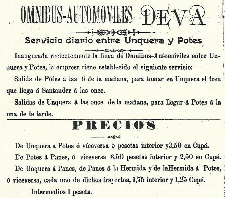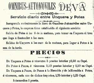 El que quiera darse un paseo a pie desde Unquera a Potes, que tome flete de asiento en el coche de línea que sale del primer puesto a las once de Ia mañana y llega al segundo a la hora que Dios quiere. La cuesta de San Pedro la habrá de subir el viajero pasito a pasito; después, a cada instante, habrá de echar pie a tierra para ayudar a los pobrecitos caballos que no pueden con su sombra, y por último, tendrá que recoger su atillo y echar carretera adelante tragándose kilómetros como un emigrante sin suerte. No sabemos cómo se consiente tanto por quien tenga el deber de repasar e inspeccionar éste servicio.