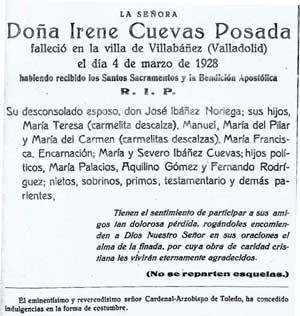 Fallecimiento En Villabáñez (Valladolid), donde residía desde hace varios meses, falleció el día 4 del actual, la señora doña Irene Cuevas Posada, natural de Trillayo. A su esposo, nuestro amigo don José Ibáñez Noriega, a sus hijos, don Manuel y don Severo, también amigos nuestros; a sus hijas, María Teresa, María del Pilar y María del Carmen (Carmelitas descalzas); María Francisca, Encarnación y María, hijos políticos, nietos y demás familia, enviamos nuestro sentido pésame. La Voz de Liébana, nº 848 de fecha 15 de Marzo de 1928 |