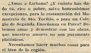 Virgen de la Luz Después de la Santa Misa celebrada por D. Benito Velarde, y predicación del Padre Benito, en el Santuario de la Luz, se celebró un concurso de bolos, con los siguientes finalistas: 1.° Jesús Villanueva, de Perrozo, 104 Bolos. 150 ptas. Resultaron clasificados para jugar el día 29 en Bedoya: Luis Vega, de Bedoya, Emilio García, de Cambarco y Raimundo Briz, de Luriezo. Concurso de baile: Ganadores: Miguel Gómez y Josefina Galnares, de Luriezo. Jesús Gómez, de Bedoya, con Segunda Cuevas, de Aniezo. |