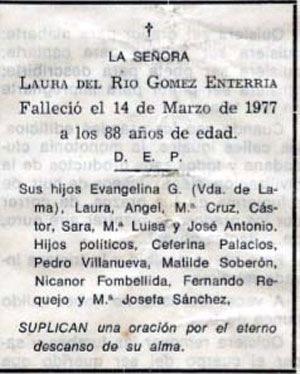 Agradecimiento Con el ruego de su publicación, nos comunican el esposo e hijos de doña Dolores Cuevas Caviedes, fallecida hace unos días en Trillayo, que trasmitamos su agradecimiento a cuantos participaron en los actos piadosos habidos en aquel pueblo y a los que de alguna forma manifestaron la condolencia por la irreparable pérdida. Gustosos lo hacemos, uniéndonos al dolor que hoy embarga a ésta querida familia de Bedoya. Luz de Liébana, nº 198 de fecha Junio de 1977 |