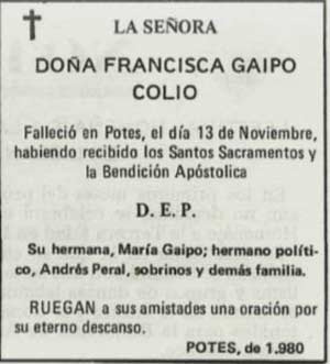 Doña Francisca Gaipo Colio, nacida en Trillayo, falleció en Potes