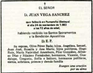 Juan Vega Sánchez, falleció en Pumareña el 24 de Noviembre de 1983 a los 72 años