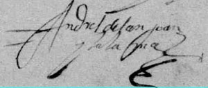 En el año 1659 ya estaba de cura en San Pedro de Bedoya, sustituyendo, por haber fallecido, a D. Domingo de Noriega. Dos años más tarde, en 1665 ya era arcipreste de Bedoya. "En primero de Julio de mil y seyscientos y sesenta y zinco años yo Andres de San Juan y la Lama cura y arzipreste en este valle de de Bedoya....." . En el año 1682 aún seguía como arcipreste, cesando como cura de la parroquia de Bedoya en el año 1685. Residió en Pumareña donde estaba la casa rectoral.