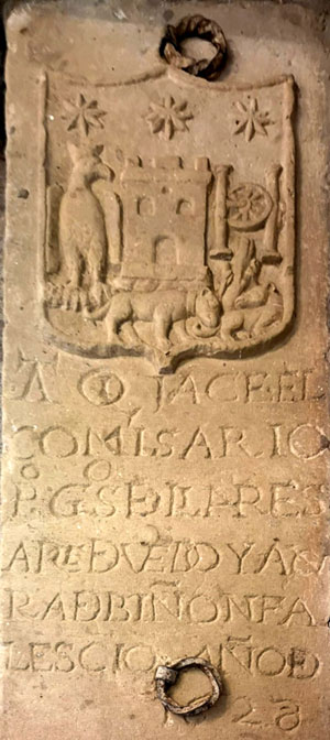 "AQUI JACE EL COMISARIO Pº GOS. DE LINARES ARZPte DE VEDOYA CURA DE BIÑON. FALLESCIO AÑO 1628" |