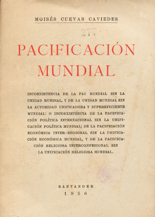 En el año 1.956 publicó un libro titulado "Pacificación Mundial". Libro donde manifiesta de una manera filosófica, política, económica y religiosa un minucioso estudio del mundo que nos rodea buscando el equilibrio, la paz y la prosperidad. Para ello nos descubre las formas y maneras que nos conducen a ello, anticipándose a los tiempos al explicarnos cómo debe ser un sistema electoral para elegir los mandos, buscando siempre el bienestar común, la paz y el equilibrio entre la sociedad local, nacional e internacional. No hay paz verdadera sin unidad verdadera. Se necesita un equilibrado sistema universal de dimensiones políticas, económicas y religiosas igualmente universales, que implante una autoridad supermundial unificadora y pacificadora de toda la humanidad y a la vez que implante la paz religiosa mundial, mediante la unidad religiosa mundial, afianzada en la verdad y en la necesidad de una sola religión universal.