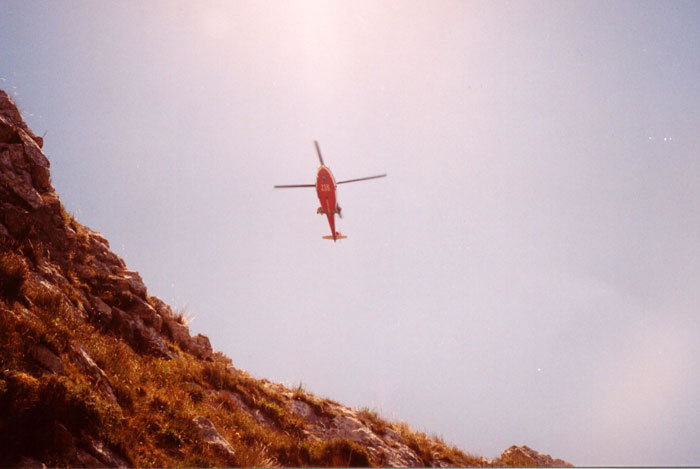 un resbalón la truncó (doble fractura de tobillo). Hubo que pedir ayuda y pronto la tuvimos. El helicóptero del Gobierno de Cantabria, con los GREIM a bordo, hizo su aparición.