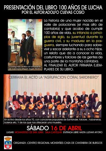 Presentaciones anteriores El próximo día 26 de Diciembre tendrá lugar en la Librería Cámara de Bilbao la presentación del libro "Cien años de lucha" de Adolfo Cuevas Cosío. Adolfo nació en Esanos en el año 1950 (ver entrevista) y a la corta edad de 4 años pasó a vivir a Mataporquera donde se trasladó la familia por motivos laborales de su padre D. José Cuevas Movellán. Después de estudiar un par de años en el seminario de Corbán, pasó luego a formarse como tornero en la Universidad Laboral de Gijón, lo que le supuso encontrar un trabajo en Vizcaya. Trabajando en ésta empresa, empezó con 42 años la carrera de Bellas Artes. En el año 1997 acabó la carrera y se licenció en escultura por la Facultad de Bellas Artes de la Universidad del País Vasco, lo que le ha permitido enfocar su vida por ese camino, recibiendo también clases de pintura y dibujo. Tiene esculturas, pinturas y grabados repartidos por el País Vasco, Burgos, Cantabria, Catalunya, Francia e Italia. A todo esto hay que añadir a sus ya múltiples facetas de artista, la de escritor, siendo su tercera obra ésta de "Cien años de lucha". Anteriormente, en el año 1998, escribió un libro de cuentos y en el año 2003 escribió otro sobre la empresa donde trabajó más de treinta años. El libro trata sobre la vida de su madre Dª Gregoria Cosío Torre, que nació en 1915 en La Puente (Puente Pumar, Polaciones), que en próximas fechas va a cumplir ya cien años (de ahí el título del libro).