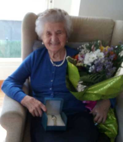 El alcalde fue el encargado, en representación del Ayuntamiento, de hacerle entrega de unos obsequios por alcanzar tan señalada celebración, consistente en un reloj y un hermoso ramo de flores, para que conserve el recuerdo que simboliza el cariño y reconocimiento de todos sus vecinos.