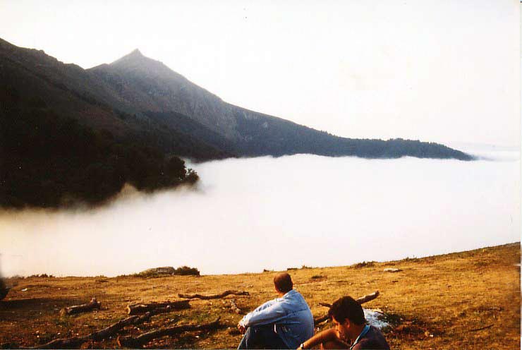 No había transcurrido mucho tiempo y aquello se volvía insoportable; el aire fuerte y frío les hacía refugiarse detrás de las rocas y de los tumbos, donde podían; empezó a nevar y entre la cellisca, la niebla, ventisca y todo lo demás no se veía a dos pasos. Con la ropa mojada, las manos heladas, la boina tapando las orejas, la “moquita” colgando de las narices... lo único que se salvaba de momento eran los pies debido al movimiento y saltos que no paraban de dar: Empiezan a dar voces para intentar reunirse los más cercanos; muchos no eran conocedores del terreno, por cierto bastante peligroso, y con ello la dificultad se incrementaba.